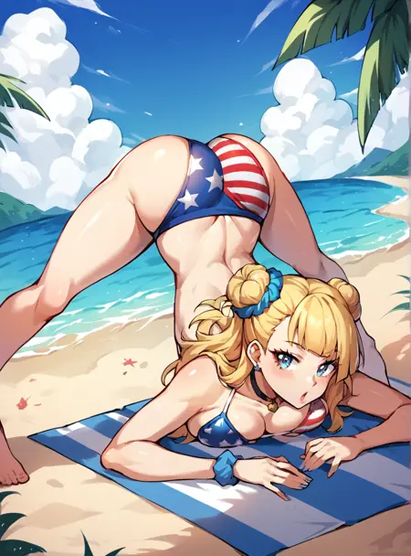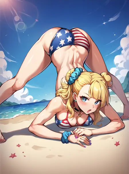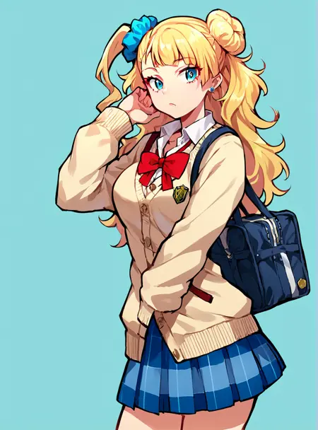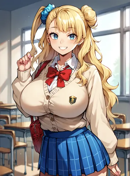 프롬프트: 긴 머리, 비대칭 머리, 금발, 파란 눈, 머리 뾰족, 스런치, 한쪽 머리 뾰족, 보석, 귀걸이, 학교 유니폼, 치마, 실내 카디건, 미소, 큰 가슴,
