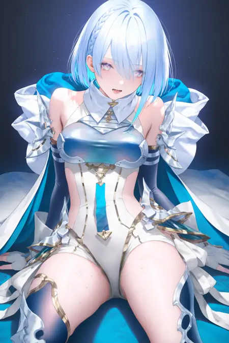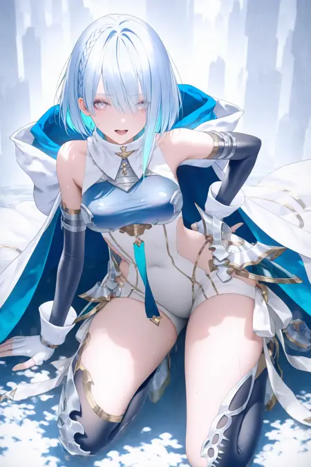 1girl,solo,breasts,blue hair,short hair,braid,sidelocks,leotard,elbow gloves,white gloves,thighhighs,bangs,grey eyes,multicolored hair,multicolored eyes,thighhighs,leg armor,white glove,armor,white cape,medium breasts,closed mouth,thighs,fingerless gloves,hood down,
