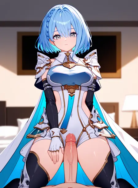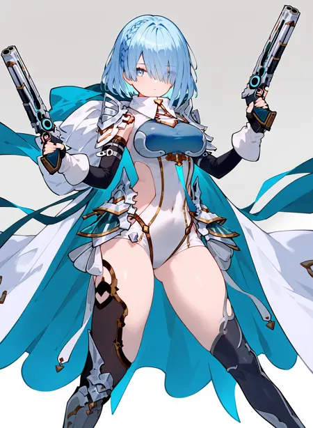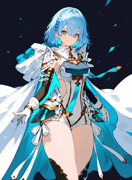 1girl,solo,breasts,blue hair,short hair,braid,sidelocks,leotard,elbow gloves,white gloves,thighhighs,bangs,grey eyes,multicolored hair,multicolored eyes,thighhighs,leg armor,white glove,armor,white cape,medium breasts,closed mouth,thighs,fingerless gloves,hood down,