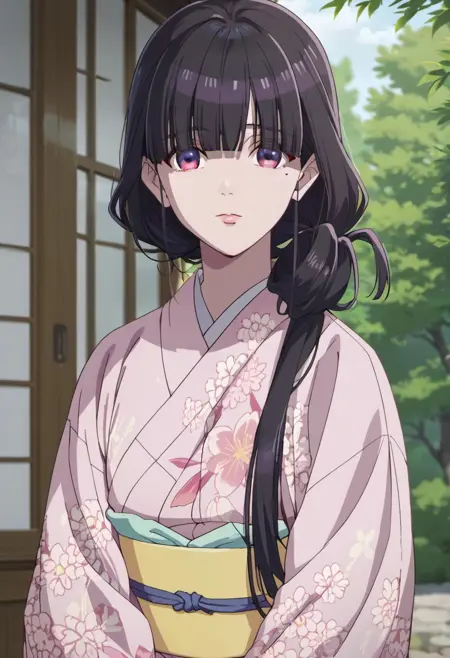 For version 3.0: saimori miyo, black hair, purple-pink eyes, long hair