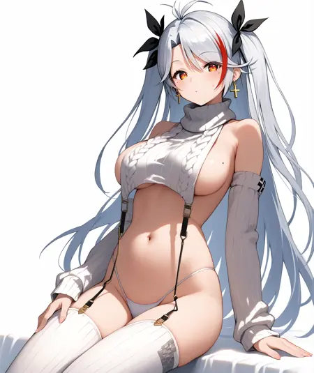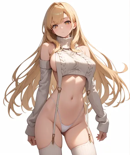 シャツ丈ハイズ、裸の肩、下着、パンツ、太もも、分離した袖、セーター、サイドブーブ、タートルネック、ハイレグ、露出度の高い服、サイドタイパンツ、リブ編みセーター、ミーム衣装、タートルネックセーター、ハイレグパンツ、バージンキラーセーター、リブ編み袖、