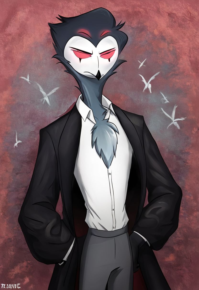 "Stolas[Helluva], FuzzyBuns[Helluva],BlueBlood[Helluva], blue body, feathers, bird, anthro, anthro bird, white face, red sclera, black hands, messy hair, large messy hair, dark blue messy hair, 4eyes, two sets of eyes, tail, bird tail, black and blue legs, (male anthro bird:1.3)."