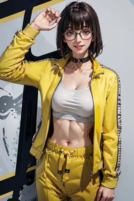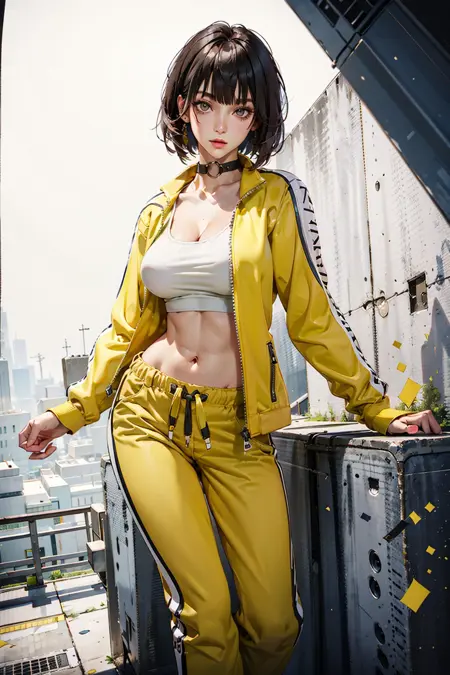 Kelly FF, 1girl, solo, breasts, short hair, bob cut, black hair, bangs, blunt bangs, looking at viewer, brown eyes, choker, jacket, yellow jacket, open jacket, open clothes, zipper, midriff, breasts, large breasts, sports bra, white sports bra, navel, cowboy shot, pants, yellow pants, sneakers, white footwear, realistic, choker