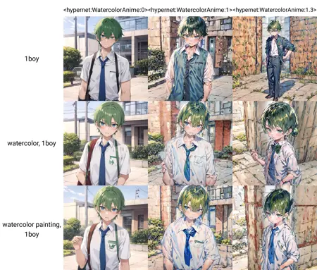 "최저 품질" 또는 "저품질"과 같은 부정 프롬프트 또는 임베딩을 사용하지 않으면, 강도 1에서 매우 강한 수채화 스타일을 보입니다.