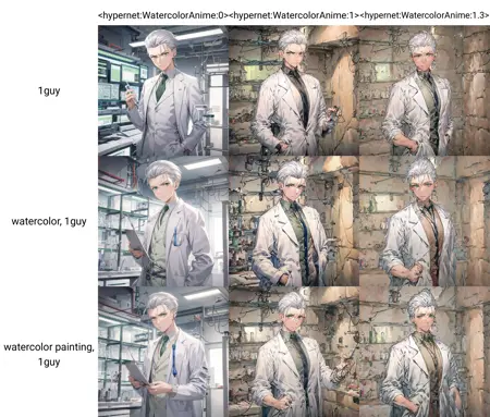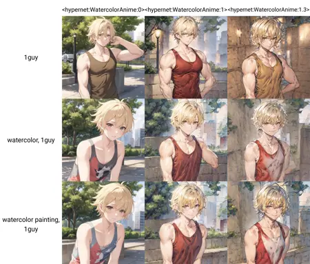 水彩风格,动漫风格,我个人最喜欢的风格之一。如需实现预期效果,请使用 anylora 模型,其他动漫模型可能会产生不同结果。