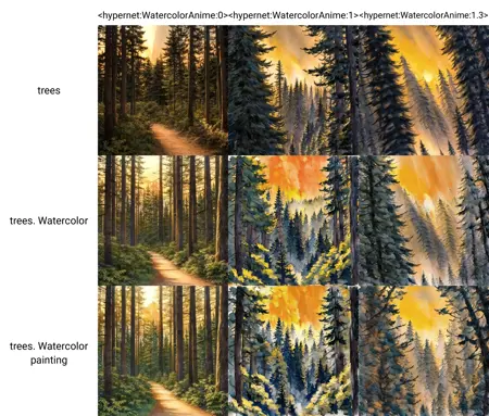 如需在不提高强度的情况下获得稍强、更接近绘画的效果,可添加关键词“水彩”或“水彩画”(示例网格中展示了一些)。