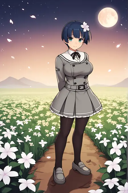 彼女の学園服のトリガー語は**"Yozakura_School, 学園制服, 白いセーラー襟, 灰色のジャケット, 黒いボタン, 灰色のスカート, スカートのフリル, 首リボン, 灰色のベルト, 黒いパンティーホース, 灰色のローファー"**です。