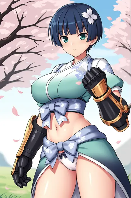 LoRAのトリガー語は**"Yozakura_XL, 青緑色の目, 深藍色の髪, 短髪, 髪の花飾り, 大きな胸"**です。