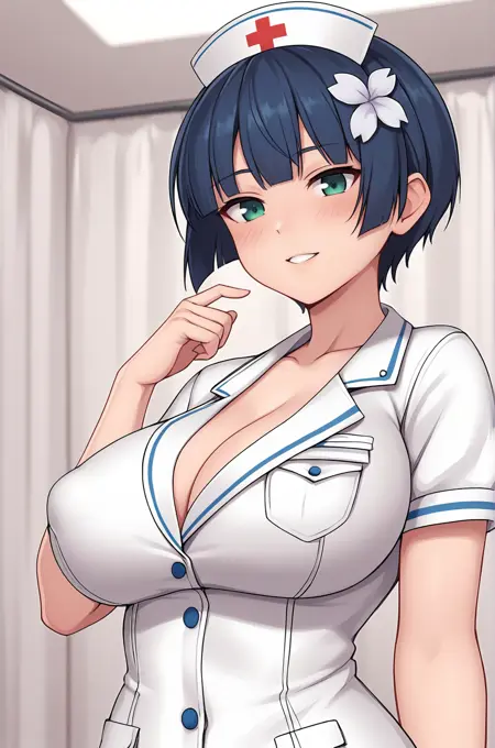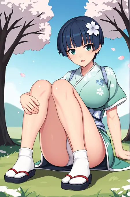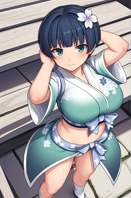 LoRAのトリガー語は**"Yozakura_IL, 青緑色の目, 深藍色の髪, 短髪, 髪の花飾り, 大きな胸"**です。