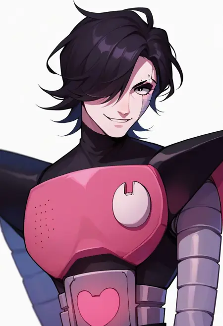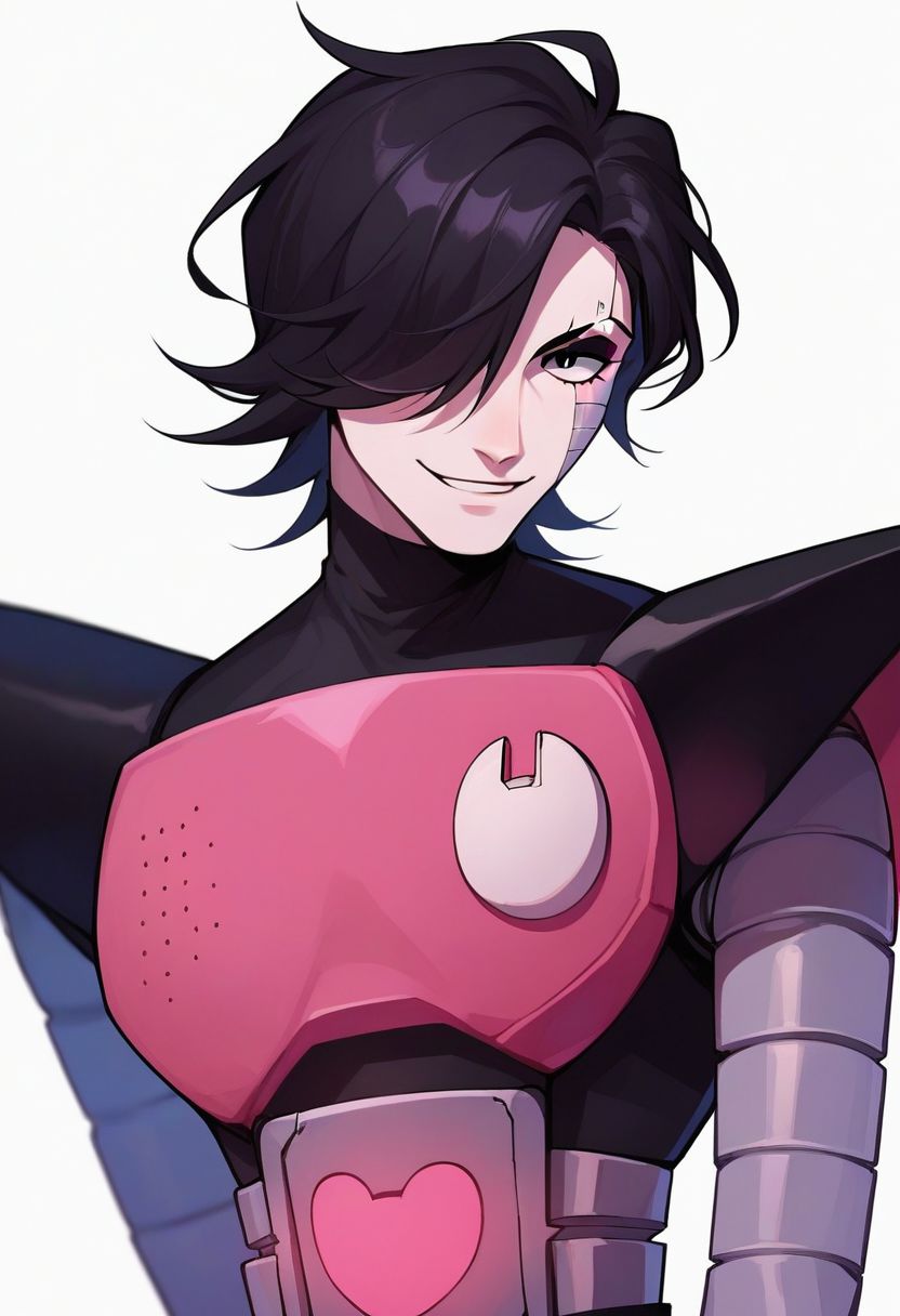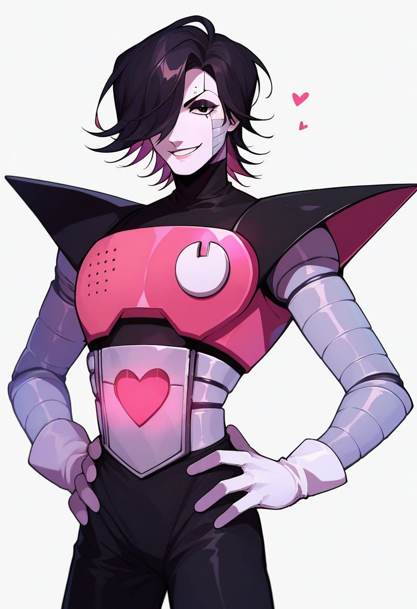 Mettaton, robot boy, black hair, hair covering left eye, black eyes, makeup, white skin, pink chest piece, black shoulder pads, white gloves, heart on waist, black tights, pink high heel boots