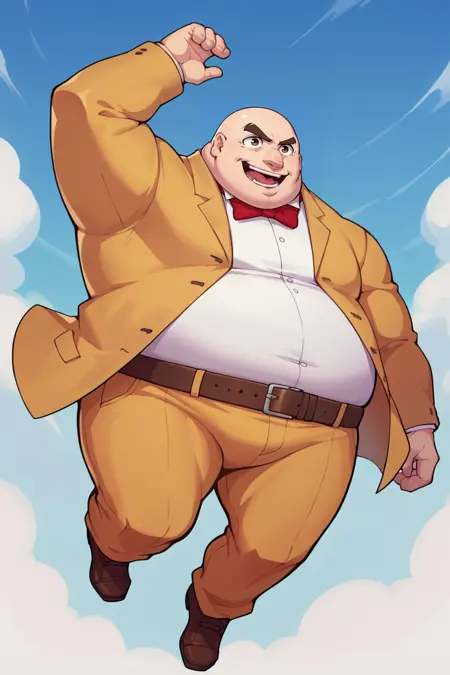 그의 전형적인 외모를 위해 "yellow jacket, formal, white shirt, red bow tie, belt, yellow pants, brown shoes"를 추가하세요.