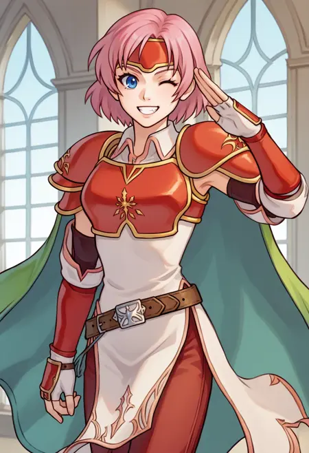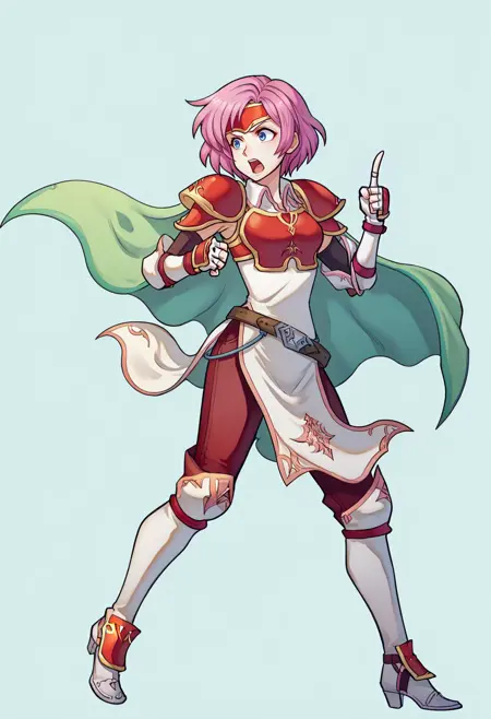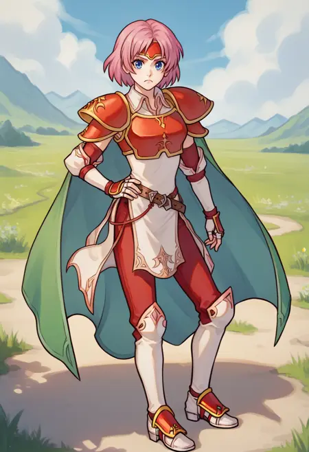 Path of Radiance 외모: defMarcia, 단발, 흰색 투닉, 칼라 셔츠, 단팔, 빨간 갑옷, 가슴판, 머리띠, 어깨 갑옷, 빨간 팔장갑, 벨트, 허벅지 부츠