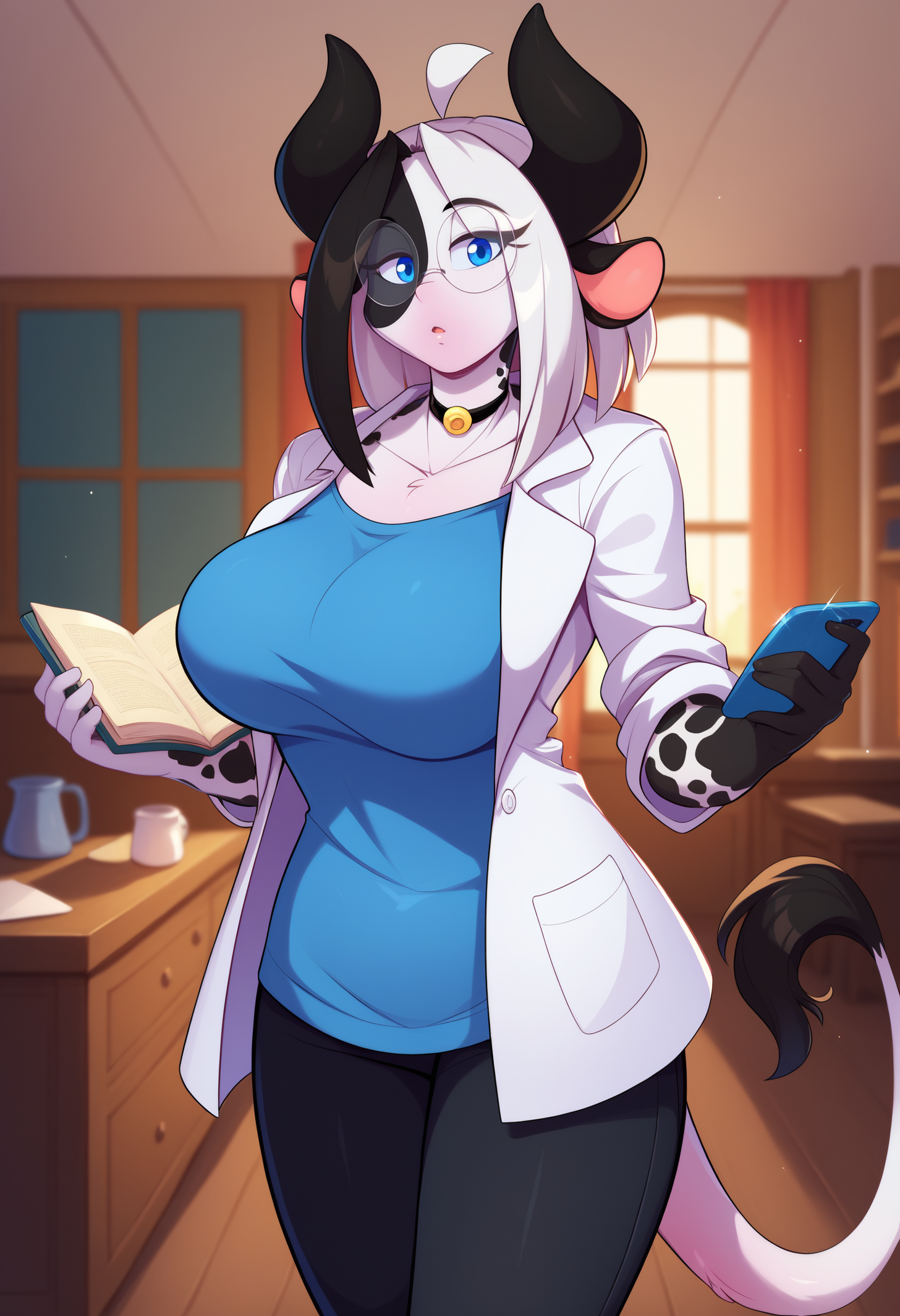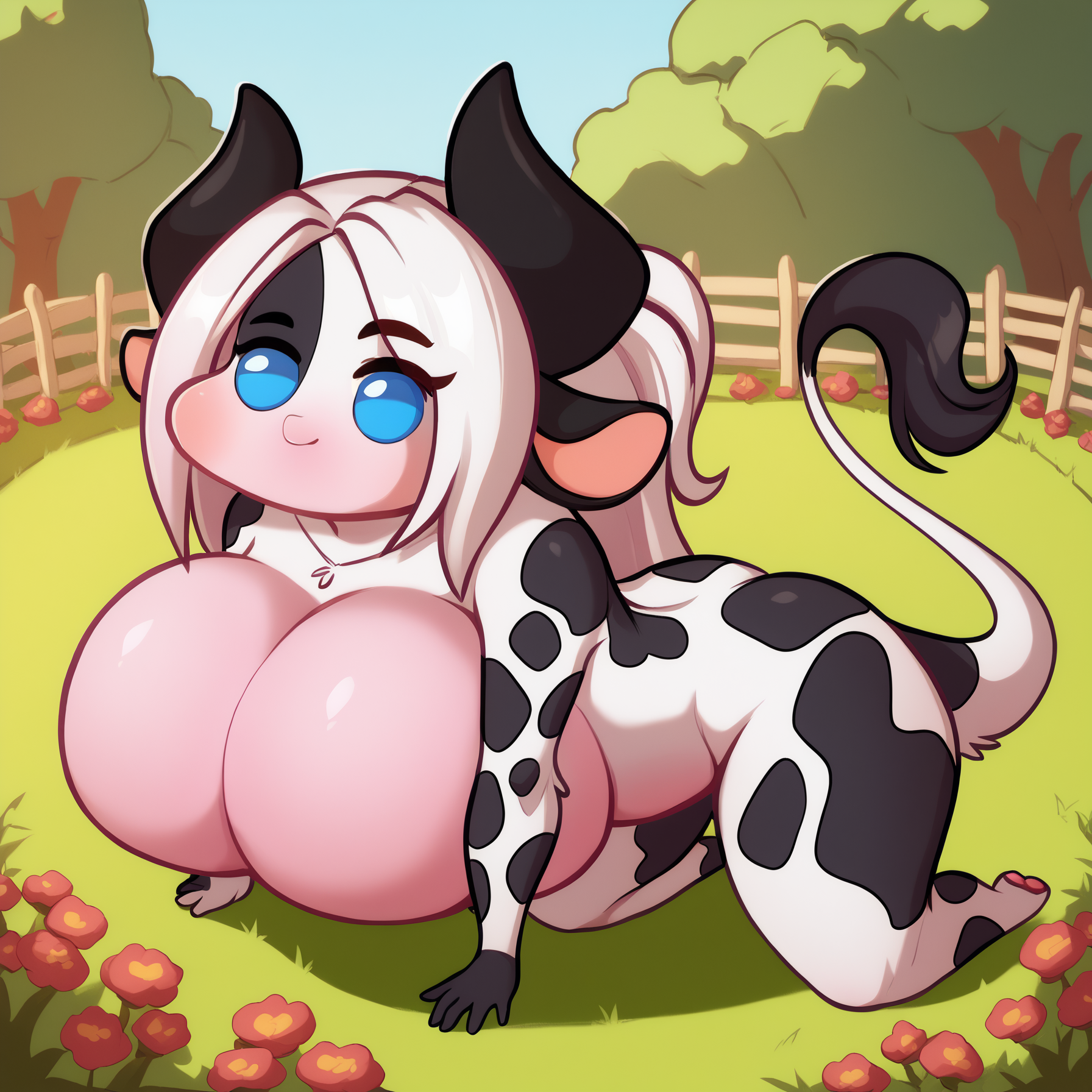 Trigger: "alejandra, blue eyes, cow girl, animal ears, cow tail, two-tone hair" always needed.