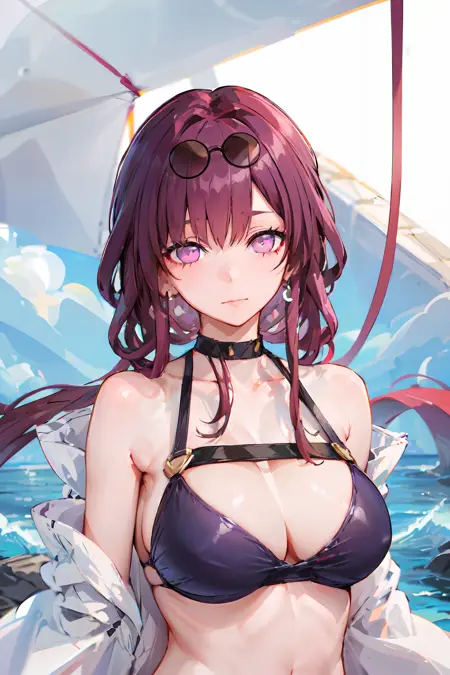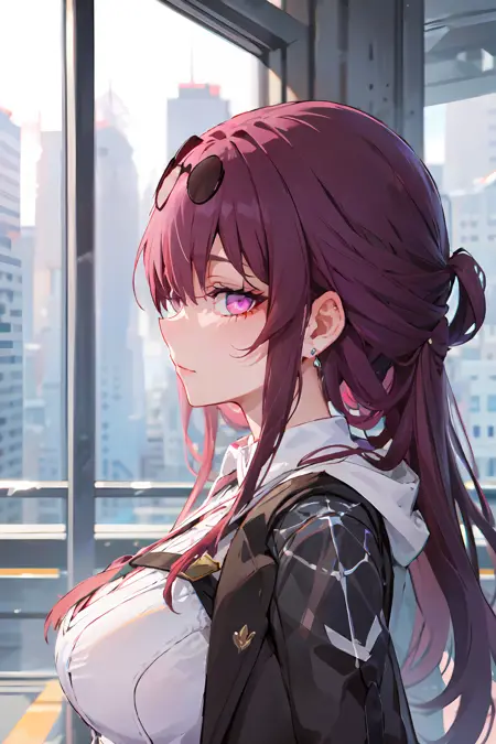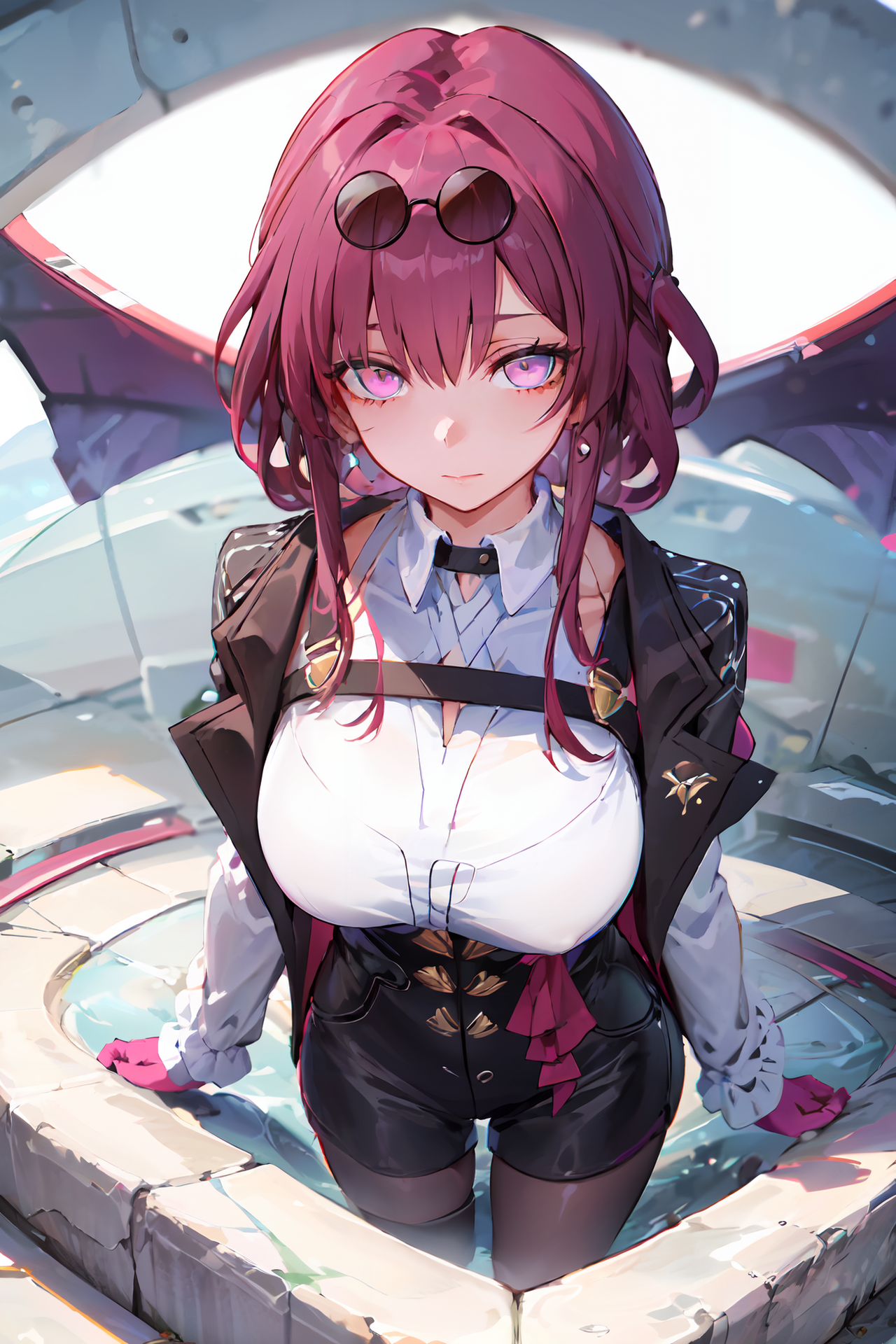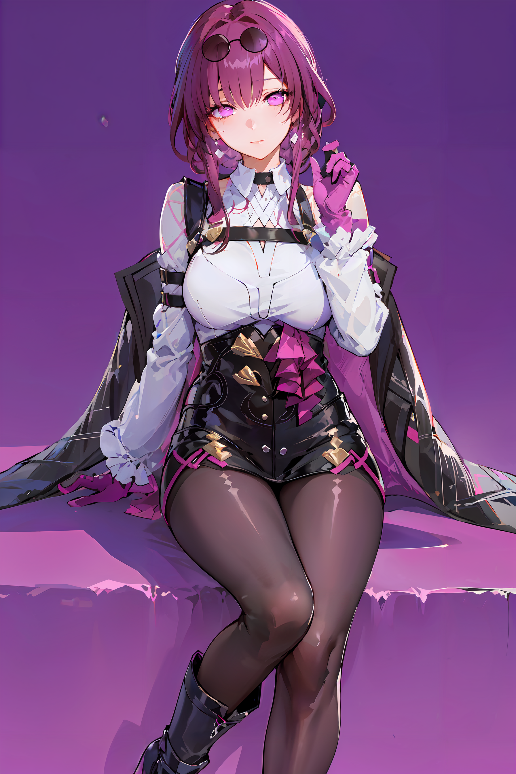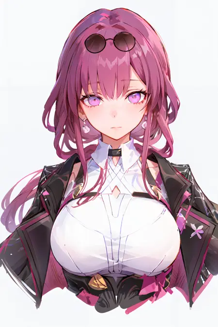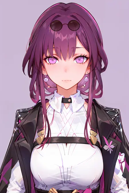 추천 사용 트리거어: 1girl, official, purple eyes, (empty eyes:1.2), eyewear on head, black jacket, jacket on shoulders, shirt, shorts, pantyhose, boots