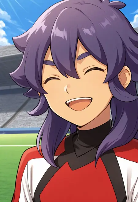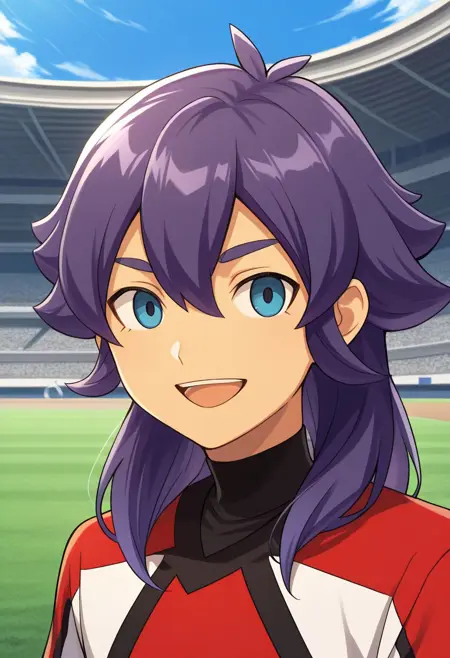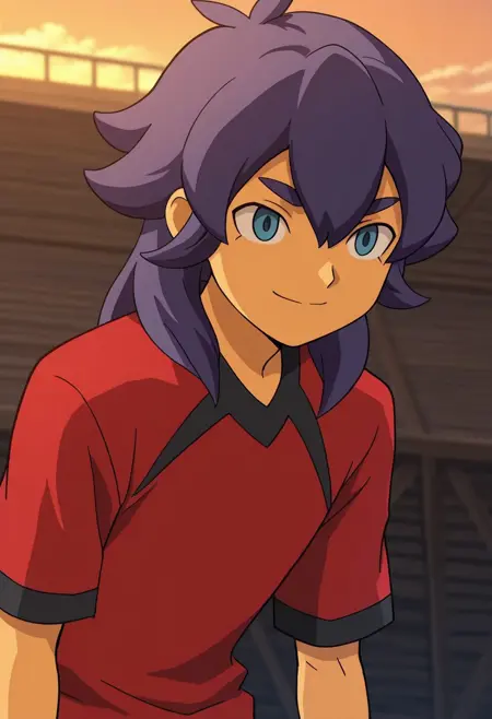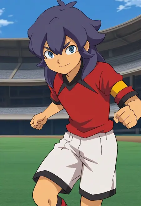 KishibeTai, 1boy, male focus, solo, blue eyes, purple hair, hair between eyes, long hair, kidokawa soccer uniform, shirt, red shirt, short sleeves, armband, shorts, white shorts, socks, red socks, shoes, sneakers,