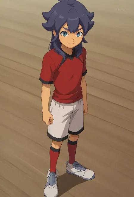 KishibeTai, 1boy, male focus, solo, blue eyes, purple hair, hair between eyes, long hair, kidokawa soccer uniform, shirt, red shirt, short sleeves, armband, shorts, white shorts, socks, red socks, shoes, sneakers,
