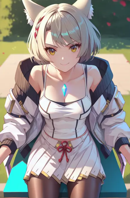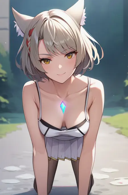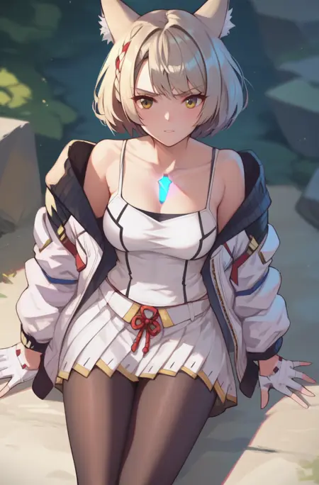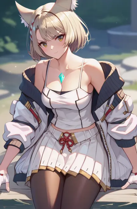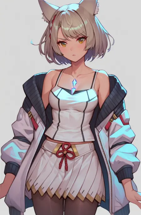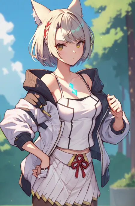 Trigger words: mio_xenoblade, short hair, skirt, animal ears, pleated skirt, cat ears, white skirt, tank top, camisole, white tank top, chest jewel, white camisole, jacket,
