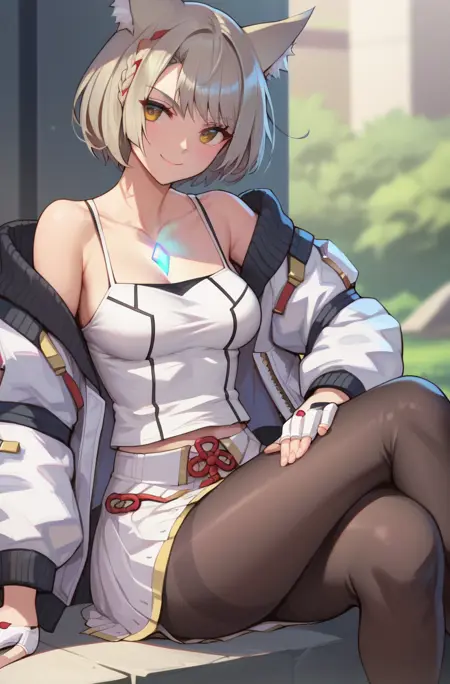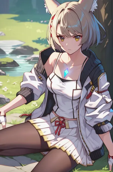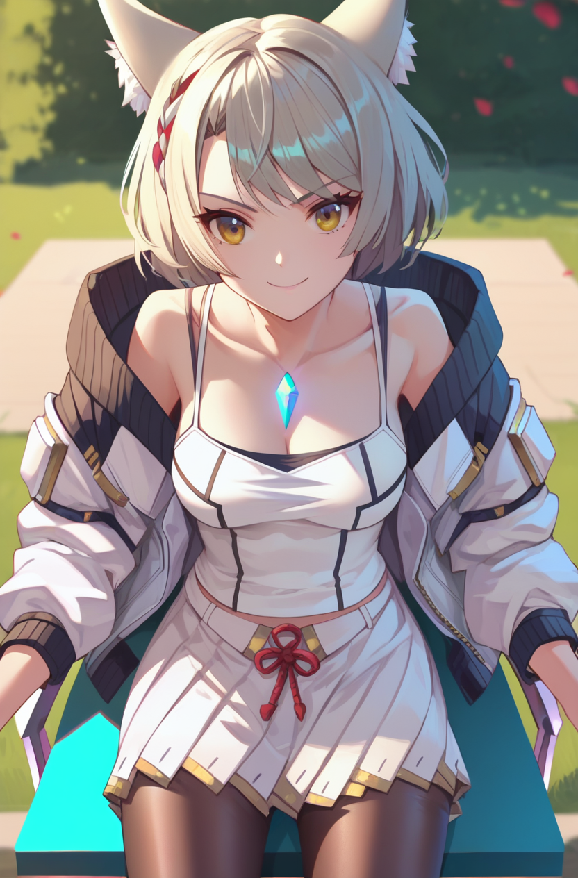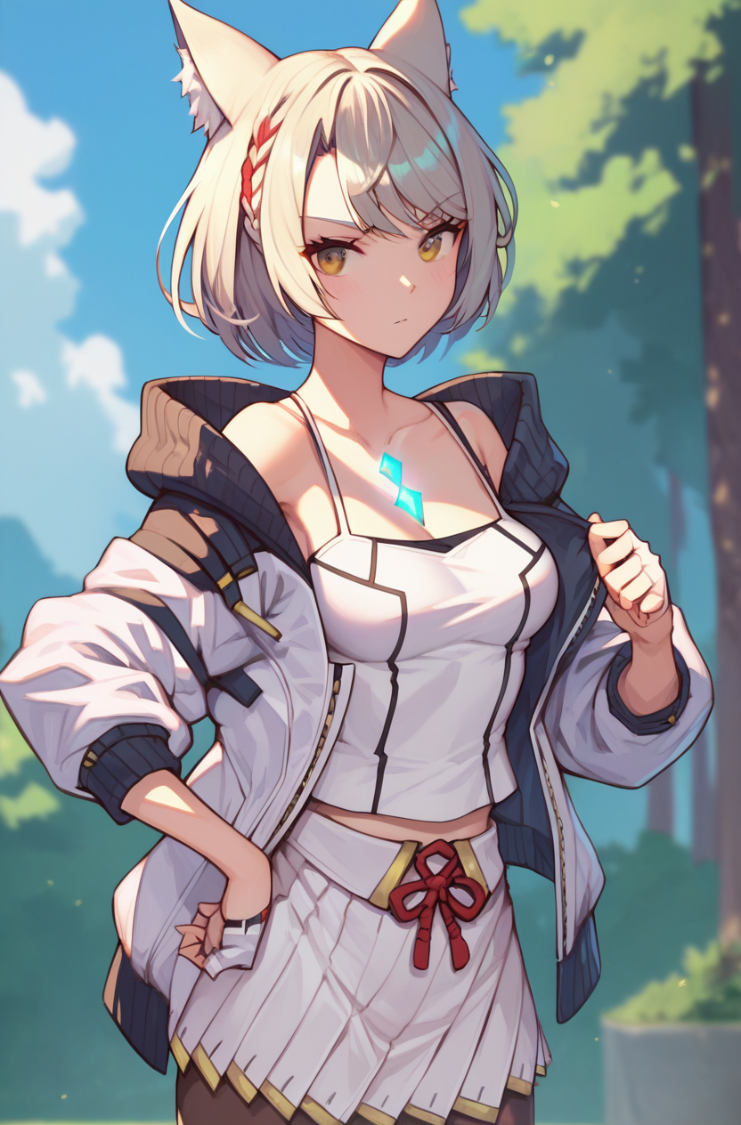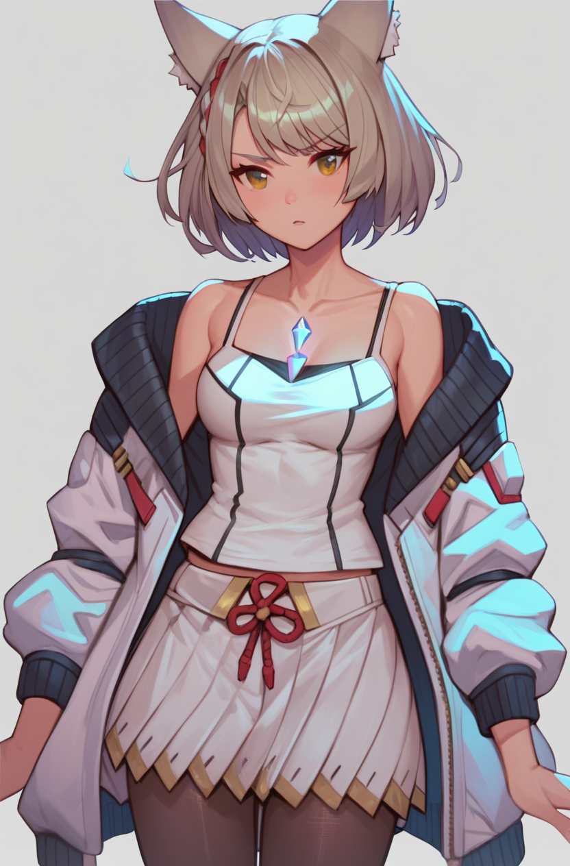 트리거 단어: mio_xenoblade, 단발, 치마, 동물 귀, 접힌 치마, 고양이 귀, 흰 치마, 탱크탑, 캐미솔, 흰 탱크탑, 가슴 보석, 흰 캐미솔, 재킷