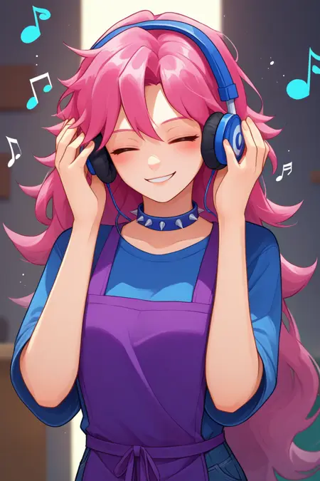 완전히 복장 갖춘 스타일리스트를 원하시면: NSStylistTerraria, 분홍 머리카락, 긴 머리카락, 녹색 눈, 파란 셔츠, 보라색 앞치마, 청바지, 스파이크 목줄, 스파이크 손목밴드, 헤어밴드, 헤어보