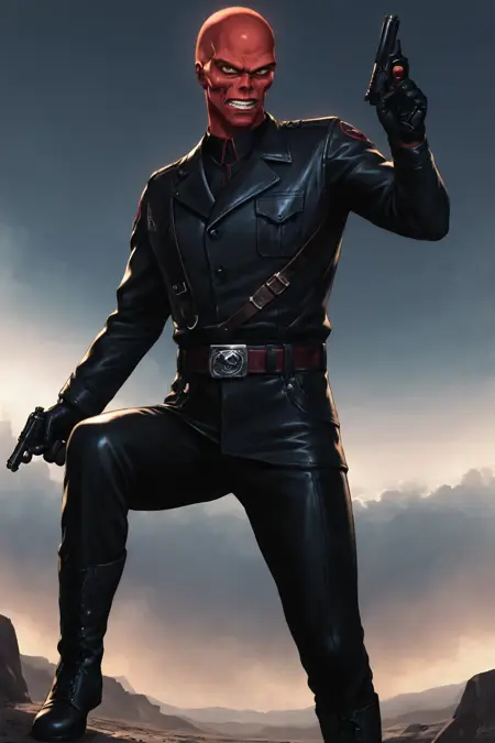 ポジティブトリガーワード:1boy、手袋、歯、ハゲ、拳銃、ベルト、黒手袋、制服、観察者を見つめる、色付き肌、赤い肌、レザー、ジャケット、銃を握る、ブーツ