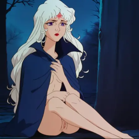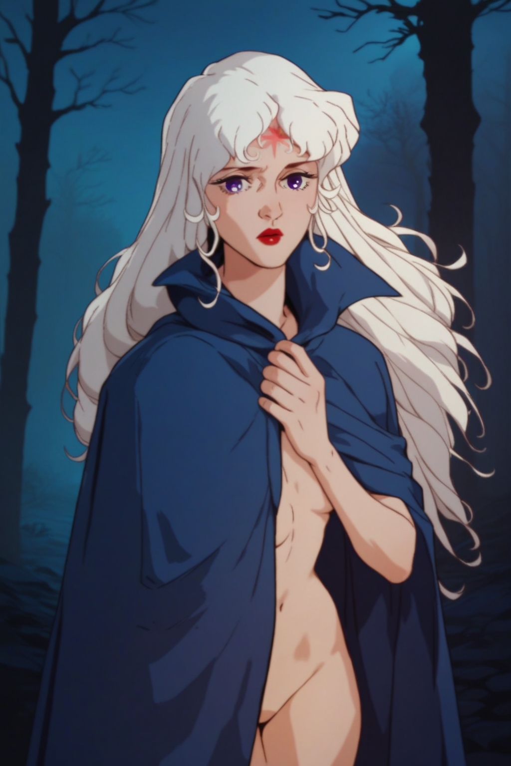 amalthea, ladyamalthea, lastunicorn, 1girl, solo, long hair, purple eyes, purple eyes, white hair, small breasts, cape, wavy hair, facial mark, lipstick, cloak, red lips, forehead jewel, naked cape, naked cloak, hiding bottom,