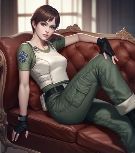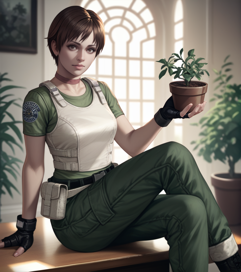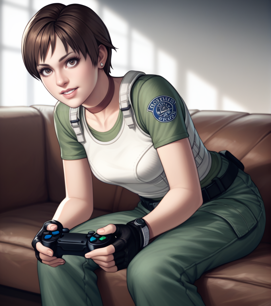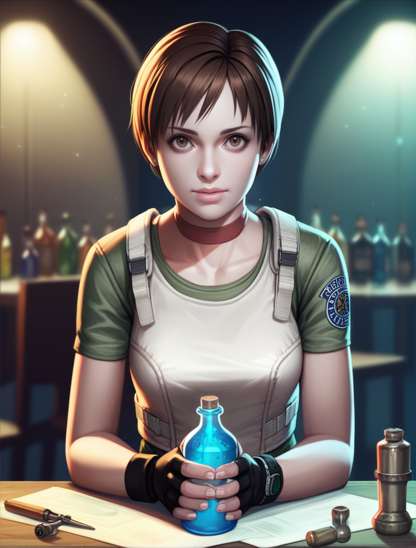 Trained on images of Rebecca from RE1 and other games where she has the same design. A large part of the training set are 3D images, so it might lean towards that at times, but you can control that via the prompt.