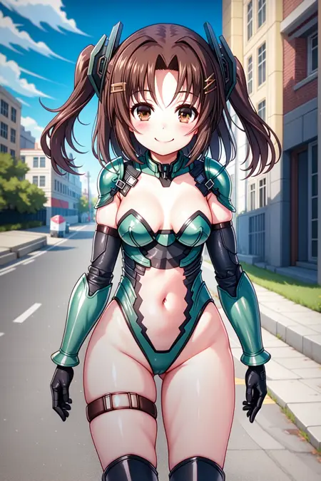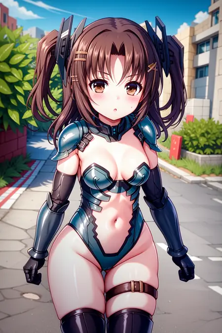 AST:灰色紧身衣,盔甲,肩甲,紧身衣,透视,腹部覆盖,皮肤凹陷,发饰,头盔,灰色长筒袜,长筒袜,大腿靴,装甲靴,大腿绑带,黑色手套,肘部手套