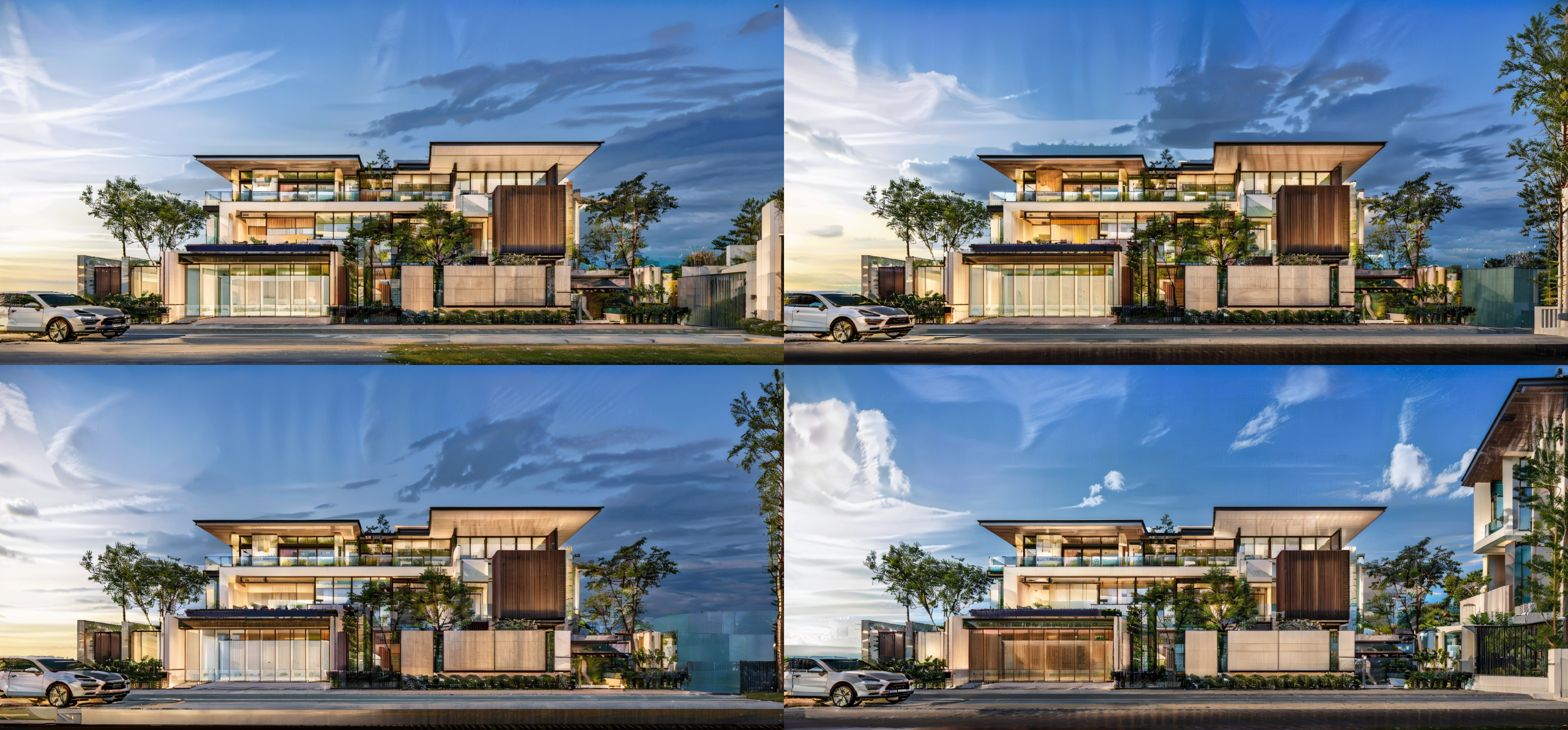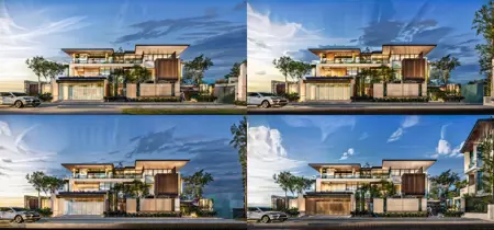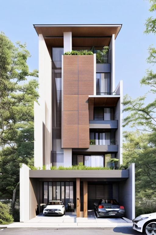 MODERN HOUSE ON THE STREET, MANY GREEN TREES ON THE BALCONY, WOODEN CEILING, HIGH TO THE CEILING GLASS DOORS, WHITE WALLS, GRAY STONE WALLS.