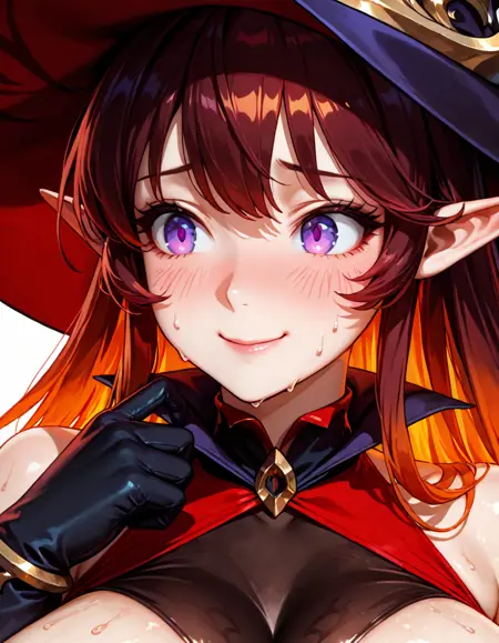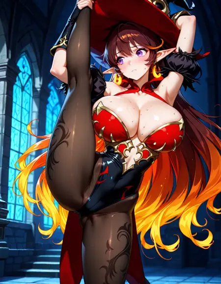 lora:transcendentnornilnoob:1 transcendentnornilnoob、とがった耳、肩を露出、パンティーホース、魔女帽、手袋、茶色の髪、発光する髪、グラデーション髪、レオタード、魔女、非常に長い髪、イヤリング、紫の目、(ハイヒール:0.8)