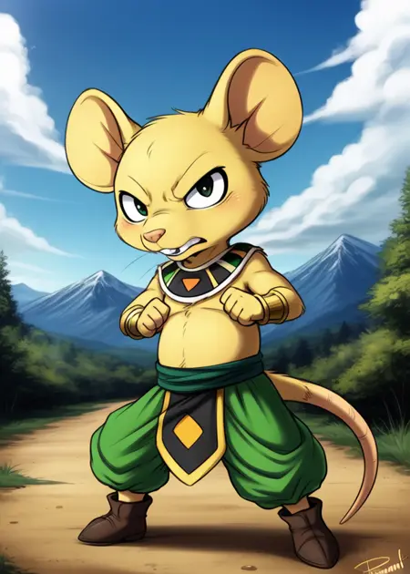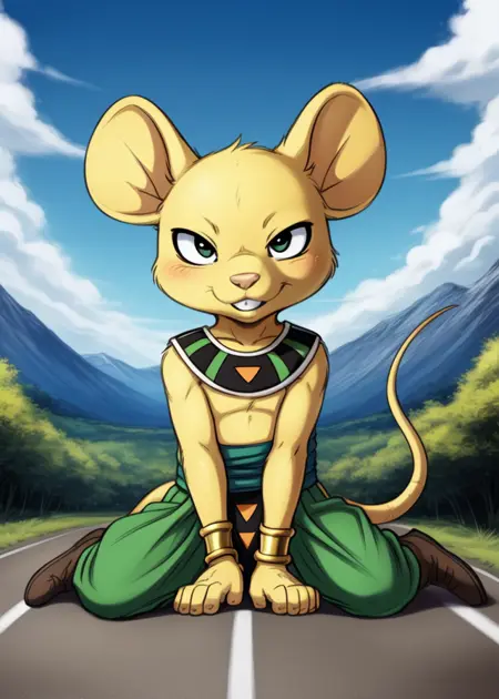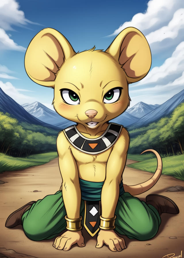 QuitelaDrBall, Mouse, yellow soft skin, gold cuffs on the arms, green pants, dark green belt, gray boots, egyptian clothes,