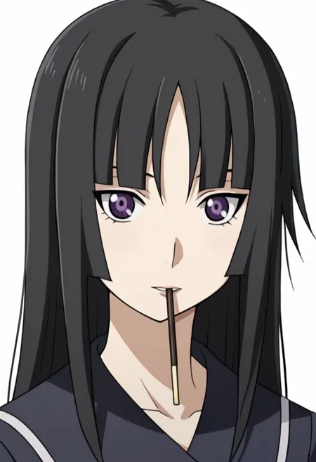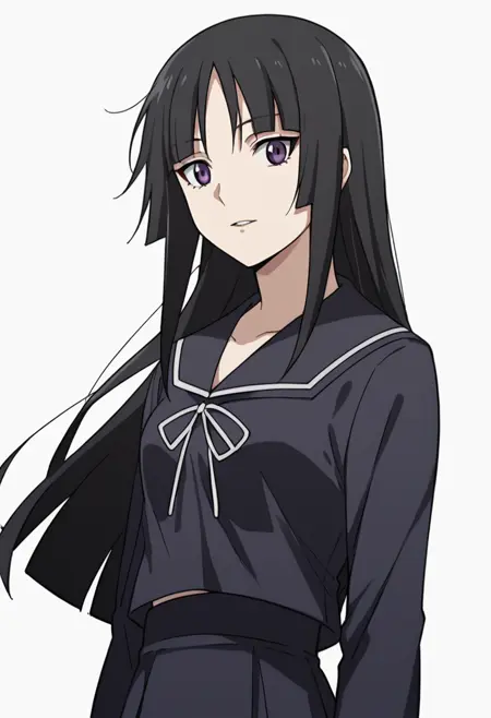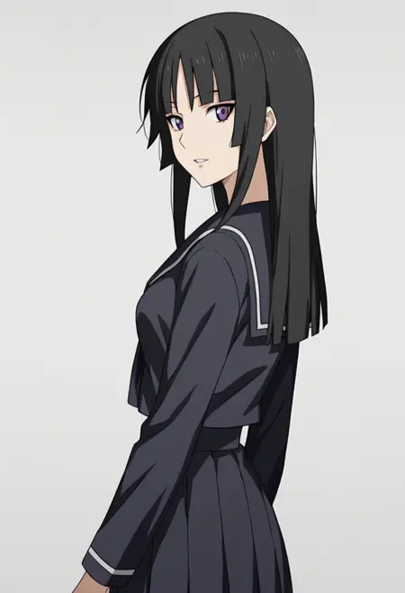 基础:i_yomi, 1girl, 单人, 长发, 黑发, 姬发式, 紫色眼睛, 微张的嘴唇, 黑色serafuku, 黄泉校服, 裙子, 黑色裙子