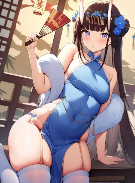 冬雪沁香(fragrance_of_the_eastern_snow):noshiro\(azur lane\), long_hair, oni_horns, blue eyes, blunt bangs, china_dress, hair ornament, garter_straps, fur_trim, hair_flower, white_legwear