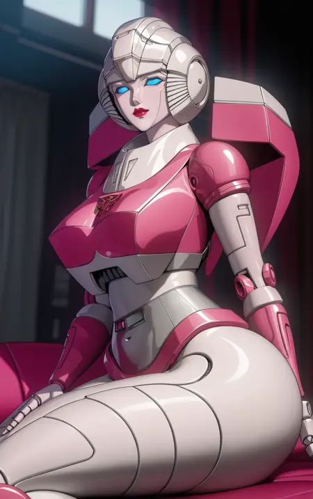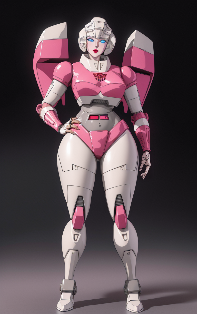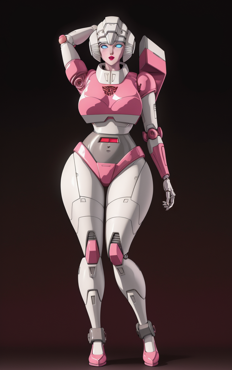1girl, autobot, robot girl, blue eyes, helmet, mecha, no humans, red lips, shiny, insignia, lipstick, breasts, glowing eyes, large breasts, wide hips, makeup, navel, thick thighs, nude, nipples, pussy,