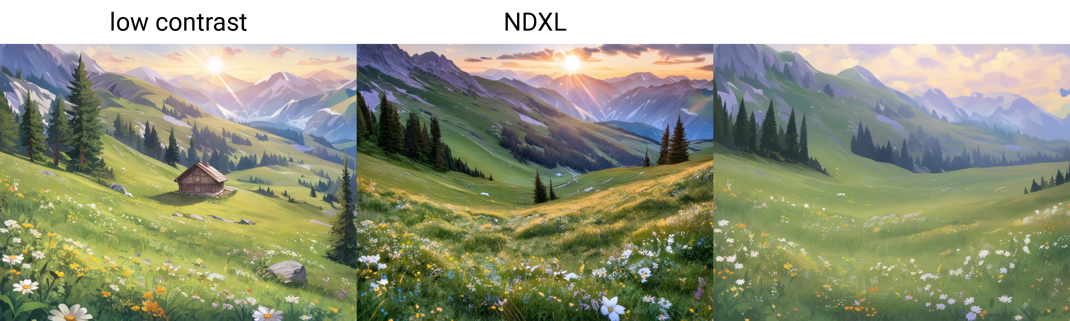 효과는 동적이며, 단순한 프롬프트일수록 더 큰 영향을 줍니다. 정확히 어떤 부분에, 어느 정도 기여하는지는 사용하는 모델과 그 모델의 반응성에 따라 달라집니다. NDXL은 일반적으로 프롬프트, 임베딩, LoRA 등 어떤 항목도 대체하지 않습니다. 최적의 효과를 얻으려면 음성 프롬프트의 맨 처음에 배치하고, 괄호와 콜론을 사용하여 강도를 줄일 수 있습니다. 예: (NDXL:0.5).