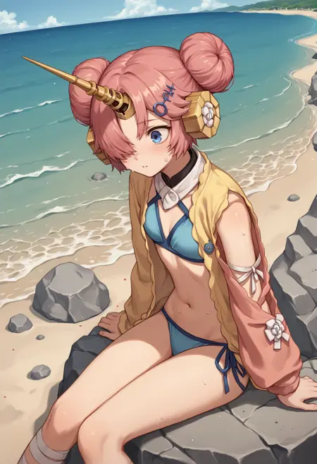 Swimsuit 1: pink hair, hair bun, double bun, heterochromia, blue eyes, yellow eyes, hair over one eye, single horn, mechanical horn, hair ornament, hairpin, bandaged arm, flower, blue bikini, asymmetrical sleeves, jacket