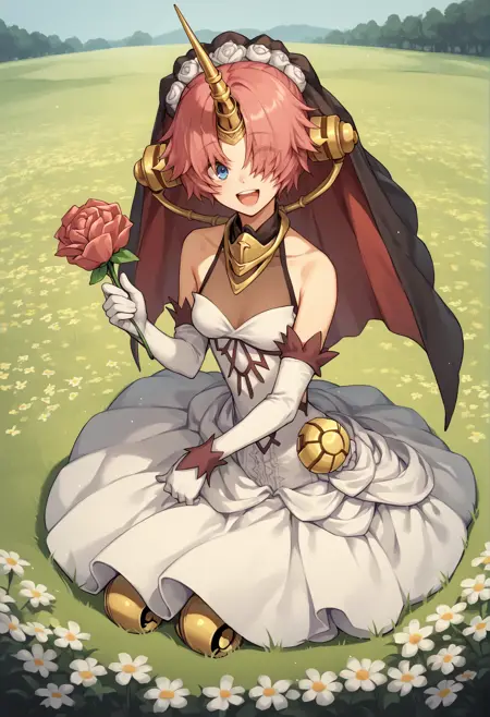 Vanilla: pink hair, hair bun, double bun, heterochromia, blue eyes, yellow eyes, hair over eyes, single horn, mechanical horn, hair ornament, see-through cleavage, bride, white dress, elbow gloves, veil, armored boots