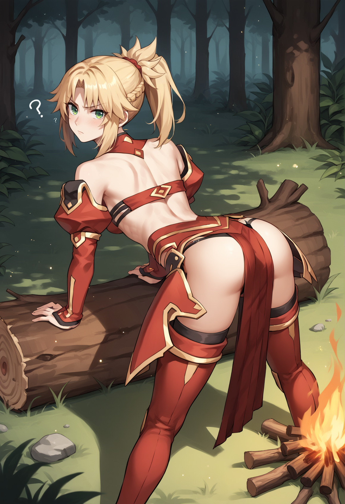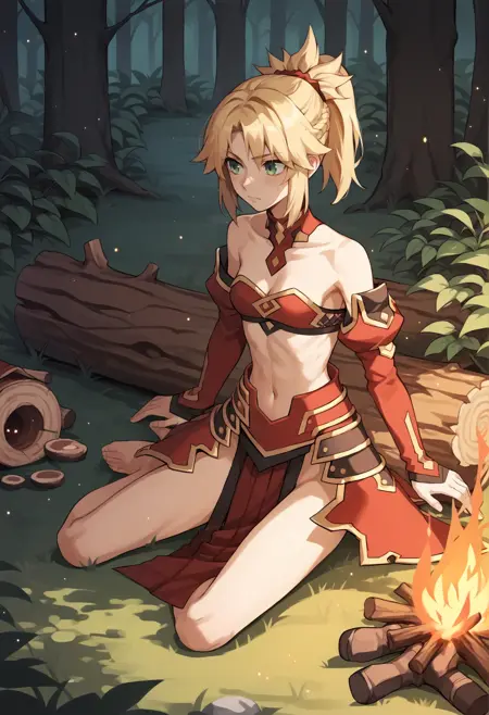 装甲: ブロンドの髪、ミディアムヘア、緑の目、編み髪、ポニーテール、赤いドレス、胸甲、手甲