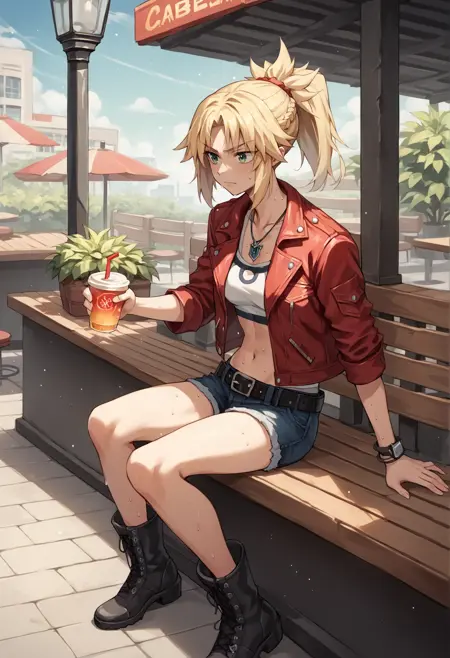 トリファス: ブロンドの髪、ミディアムヘア、緑の目、編み髪、ポニーテール、ネックレス、デニムショートパンツ、白いトップ、ジャケット、ベルト