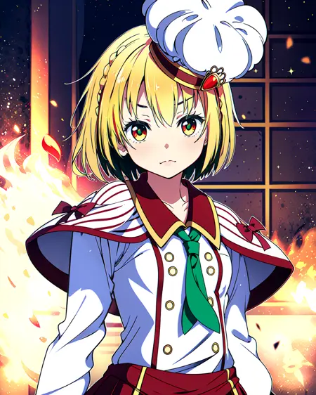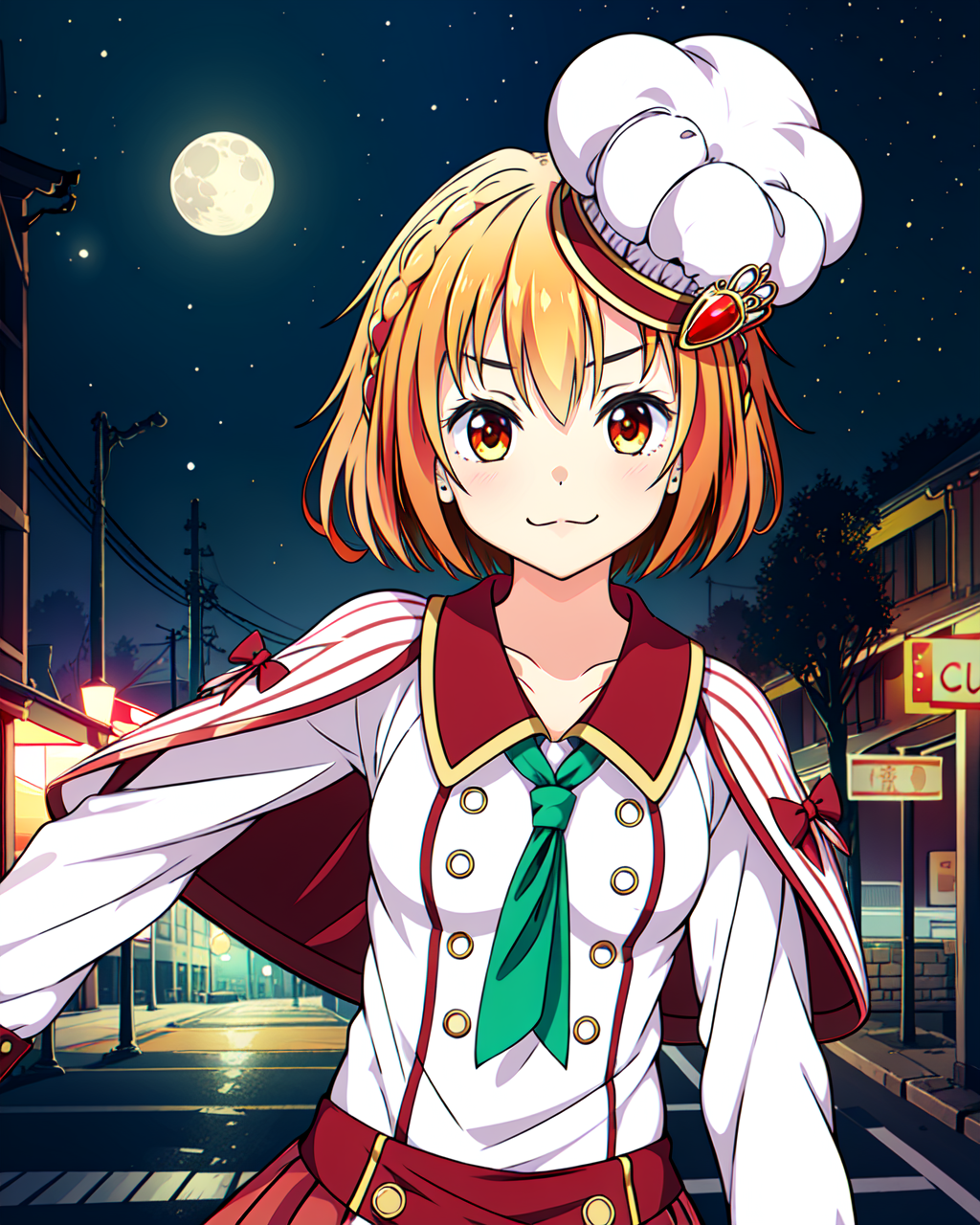 魔法服装: mgrckurumimanaka,头戴镶宝石的厨师帽,红色条纹披肩带蝴蝶结,绿色领带,白色底红色衬衫,红色底白色扣裙,黑色长筒袜
