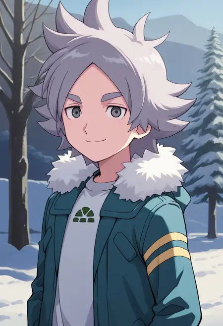fubugo, 1boy, male focus, solo, grey eyes, grey hair, shirt, print shirt, jacket, blue jacket, fur trim, hood, open jacket, open clothes, pants, green pants, shoes, brown footwear