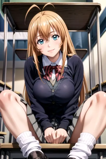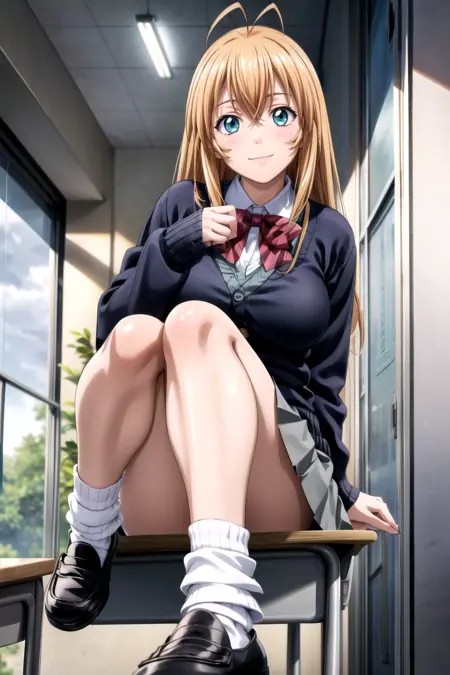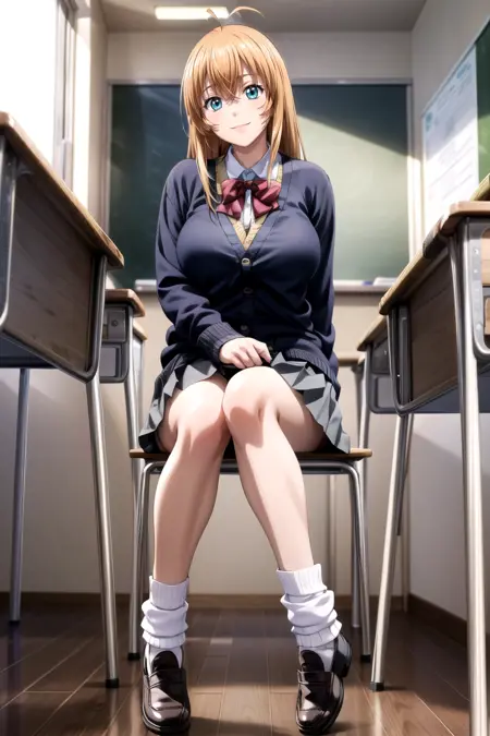 (cardigan, bowtie:1.3), (school uniform, pleated skirt, black footwear, white socks, loafers, grey skirt, loose socks),