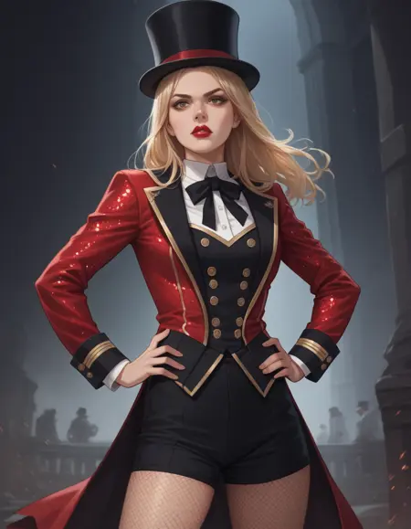 キーワード: hud_rngmstr、黒いショートパンツ、赤いロングスリーブのスパンコール短ジャケット、ボタン、トップハット、黒いネックリボン、フィッシュネットパンティストッキング
