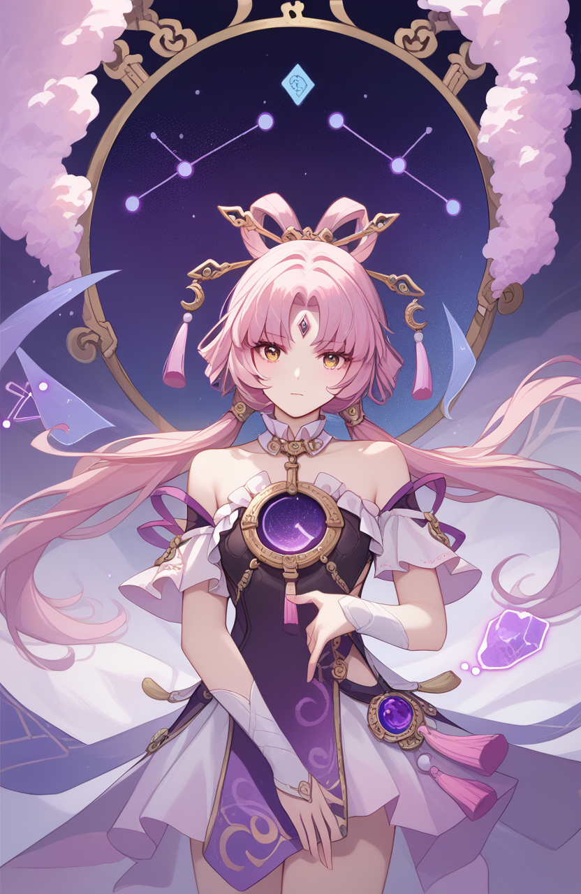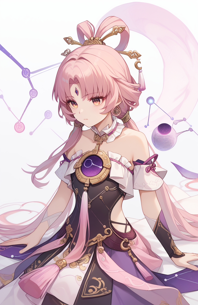 a girl named fuxuan,fuxuan,1girl,forehead jewel,low twintails,bare shoulders,detached sleeves,dress,tassel,constellation,jewelry,
