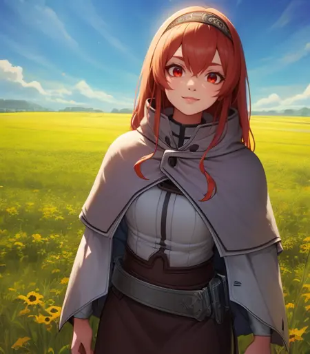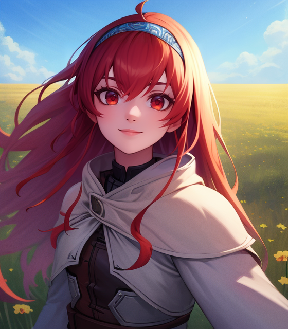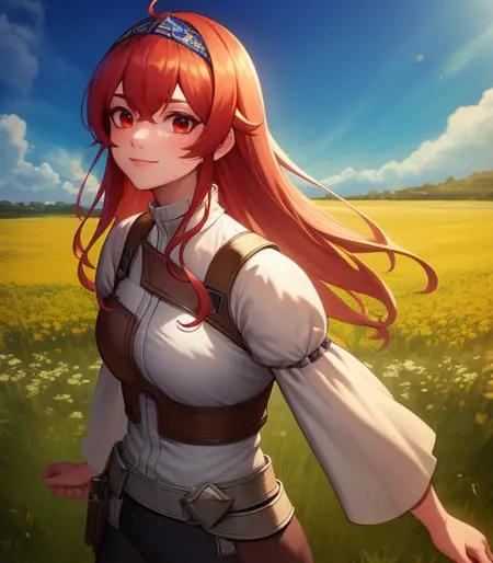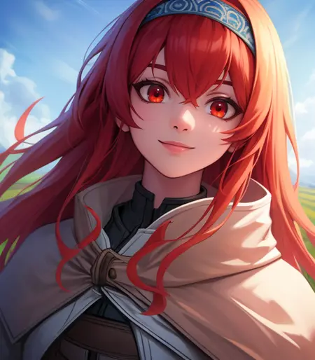 Cowboy shot, Eris Greyrat, Red eyes, Adventurer's clothes, Headband, A little smile,