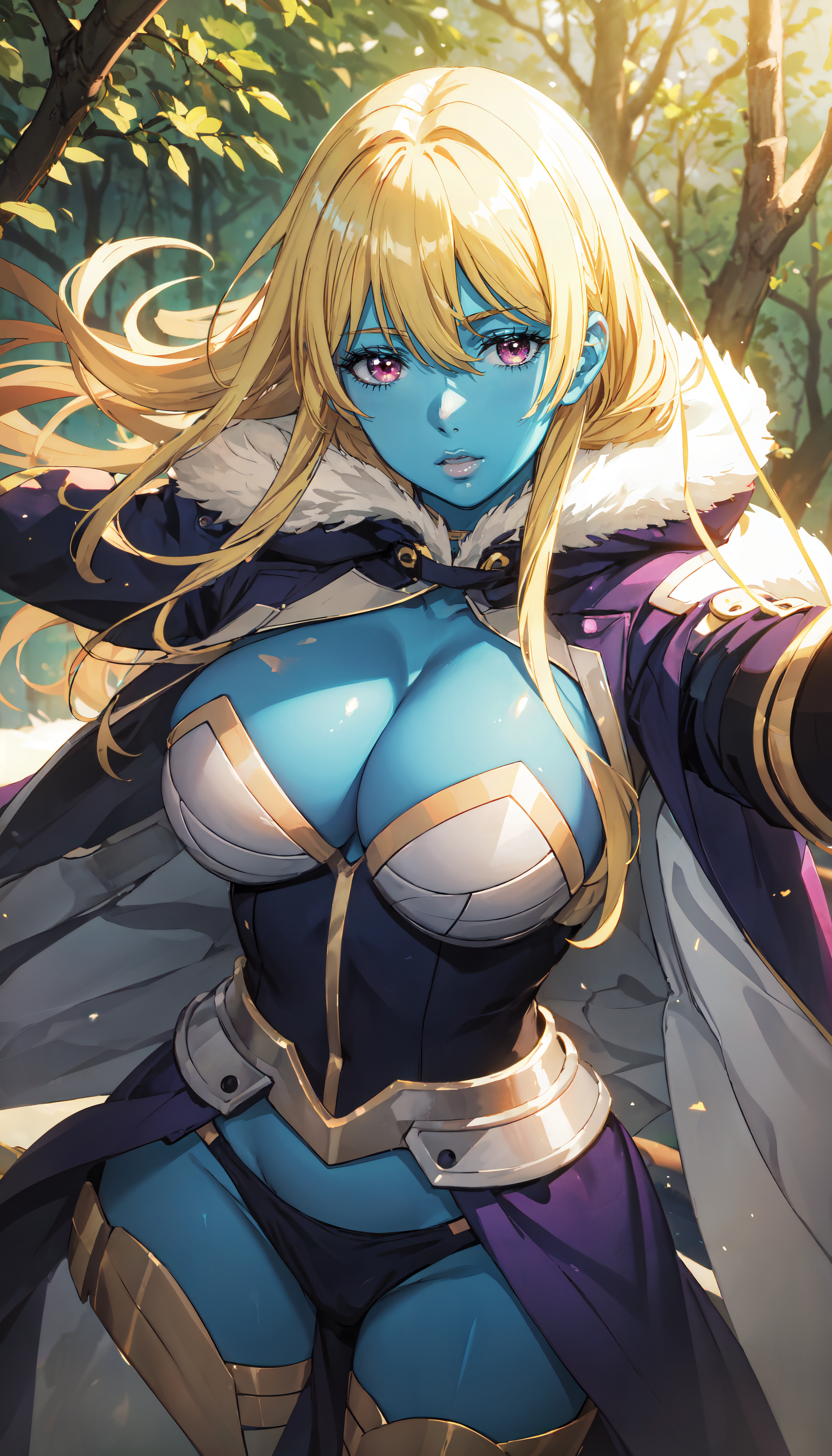 (blue skin:1.3), long hair, blonde hair, red eyes, breastplate, arm guards, purple cape, fur trim, purple panties, purple waist cape, tall iron boots