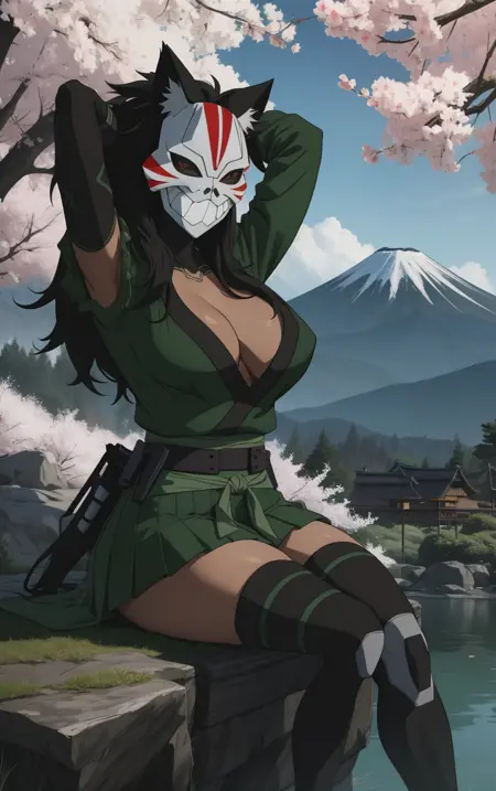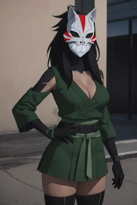 mask, masked, 1girl, long hair, breasts, medium breasts, mask on head, fox mask, black hair, spiked hair, big hair, lipstick,