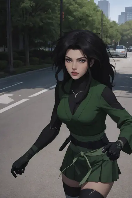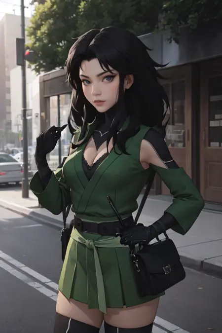 cleavage, asymmetrical_sleeves, black thighhighs, knee pads, thighhighs, japanese clothes, ninja, belt, skirt, black legwear, boots, black gloves, elbow gloves, long sleeves, green jacket, green shirt, green vest, ribbon,