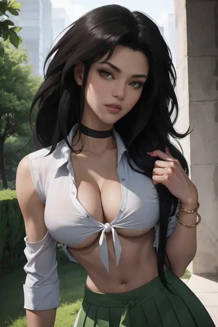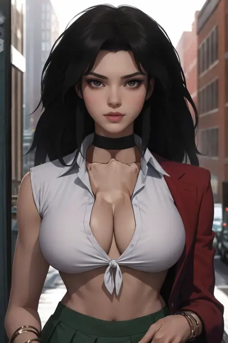 1girl, breasts, large breasts, long hair, lips, makeup, midriff, thighs, big hair, black hair, red_choker, spiked hair, lipstick, bangle,