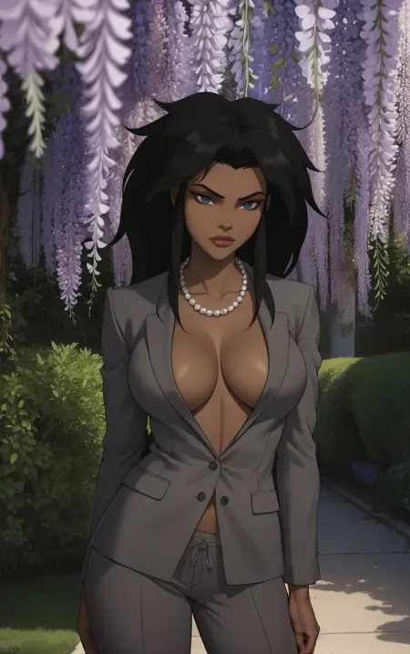 1girl, breasts, large breasts, dark skin, dark-skinned female, lips, makeup, medium breasts, thighs, tan, big hair, black hair, spiked hair, long hair, lipstick,