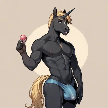 score_9, score_8_up, score_7_up, score_6_up, score_5_up, score_4_up, mariart, by mariart, random color background, furry, anthro, male, horse, brown body, blonde tail, blonde hair, holding condom, wide hips, thick thigs, blue speedo, looking_at_viewer